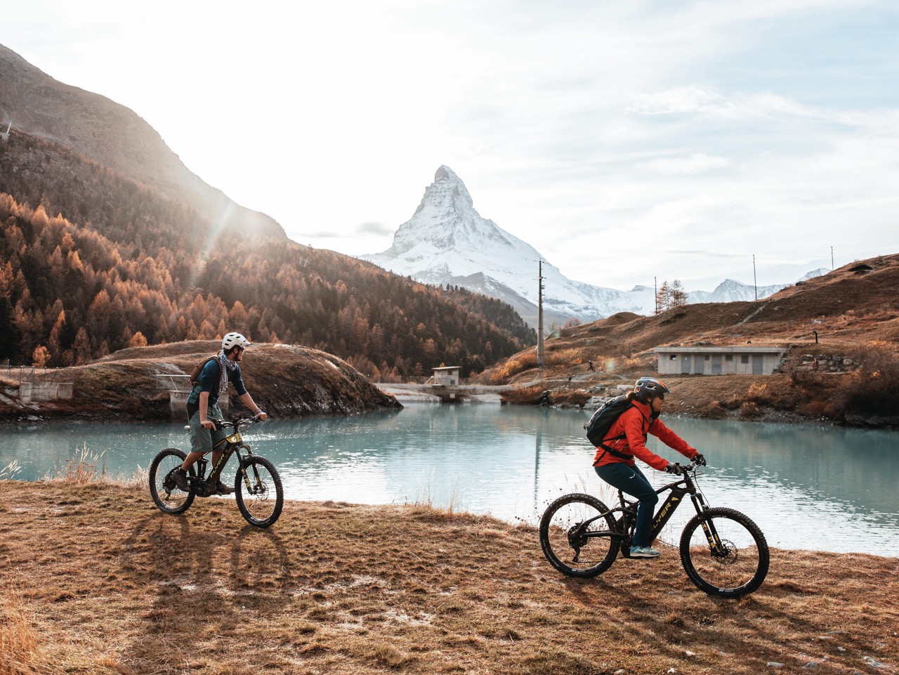 It's time to ride towards the Zermatt village. The 4,000m peaks of the Saas Valley, as well as the Weisshorn, await for us as we ride a playful trail to our final destination. We’ll soon find ourselves facing the majestic Matterhorn! A quick detour will give us an even better view, before descending into town and finding another viewpoint of this superb peak, this time from a jacuzzi.